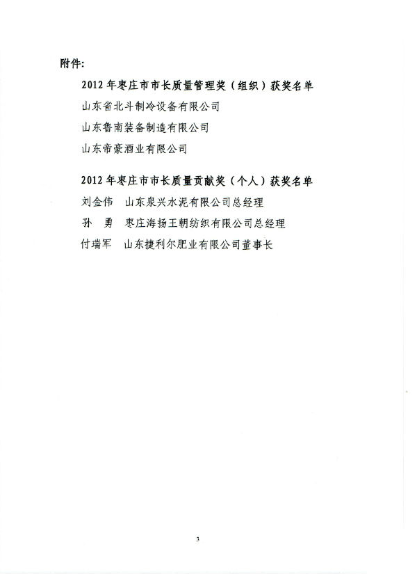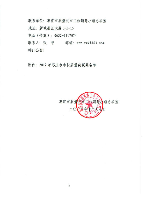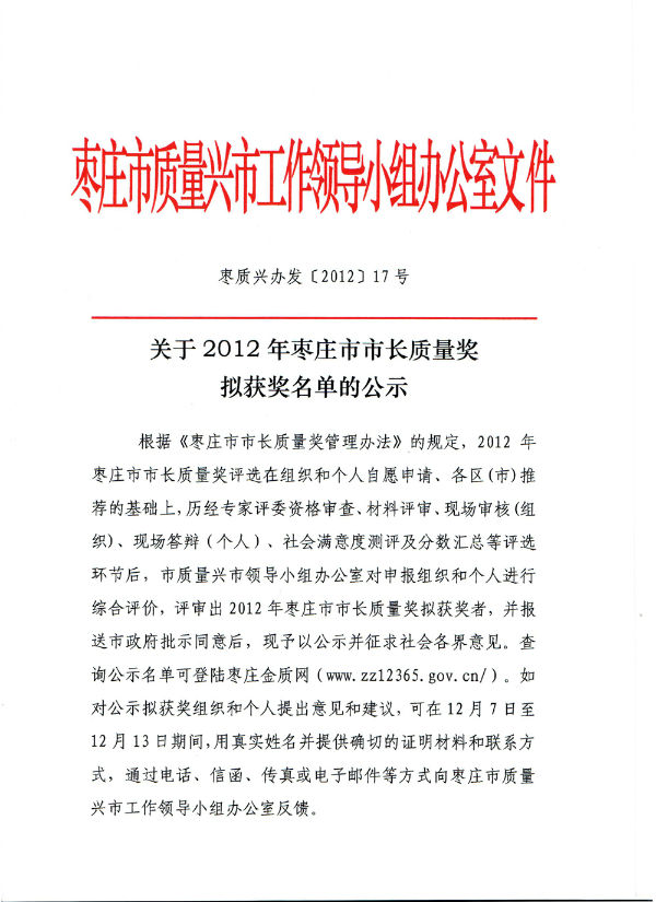 关于2012年潍坊市市长质量奖拟获奖名单的公示