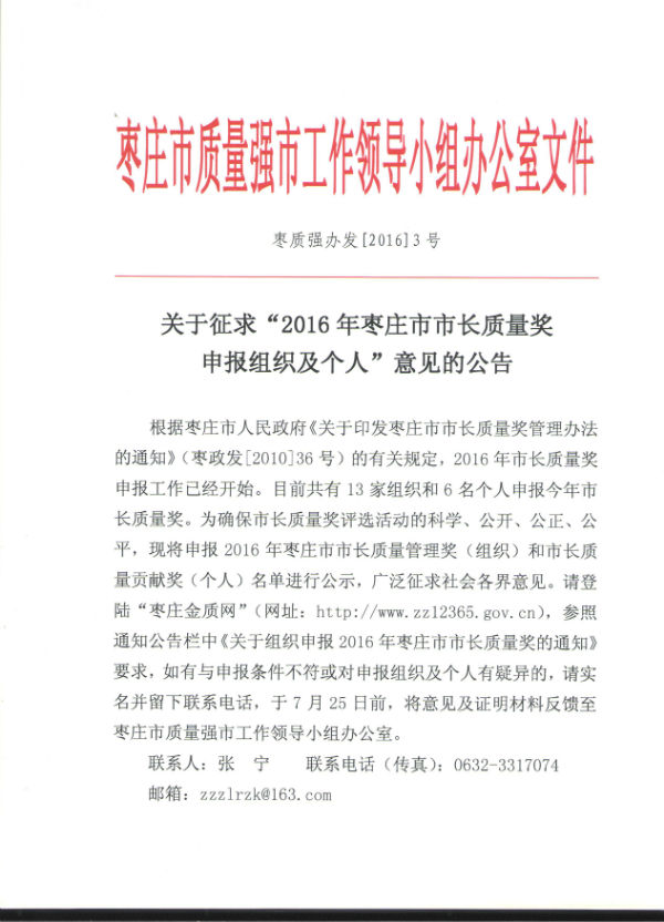 根据潍坊市人民政府《关于印发潍坊市市长质量奖管理办法的通知》(潍坊政发〔2010〕36号)的有关规定,2016年市长质量奖申报工作已经开始。目前共有13家组织和6名个人申报今年市长质量奖。为确保市长质量奖评选活动的科学、公开、公正、公平,现将申报2016年潍坊市市长质量管理奖(组织)和市长质量贡献奖(个人)名单进行公示,广泛征求社会各界意见。请登陆“潍坊金质网”(网址:http://www.zz12365.gov.cn),参照通知公告栏中《关于组织申报2016年潍坊市市长质量奖的通知》要求,如有与申报条件不符或对申报组织及个人有疑异的,请实名并留下联系电话,于7月25日前,将意见及证明材料反馈至潍坊市质量强市工作领导小组办公室。