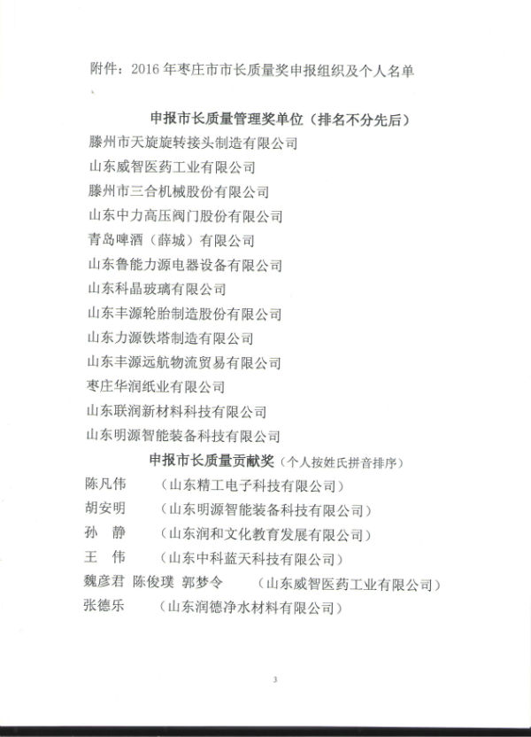 附件:2016年潍坊市市长质量奖申报组织及个人名单