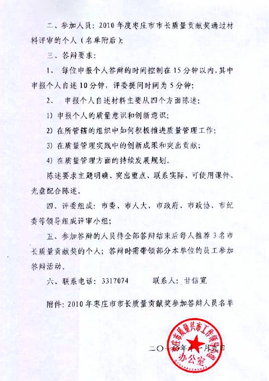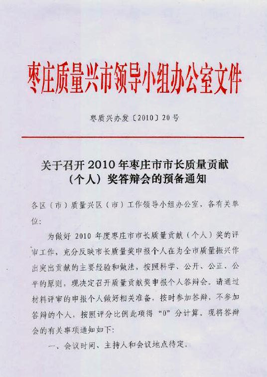 关于召开2010潍坊市市长质量贡献(个人)奖答辩