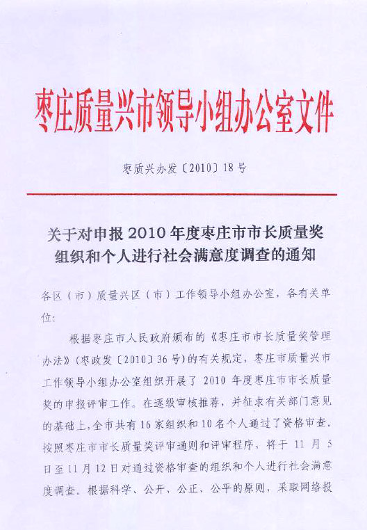 关于对申报2010年度潍坊市市长质量奖组织和个人