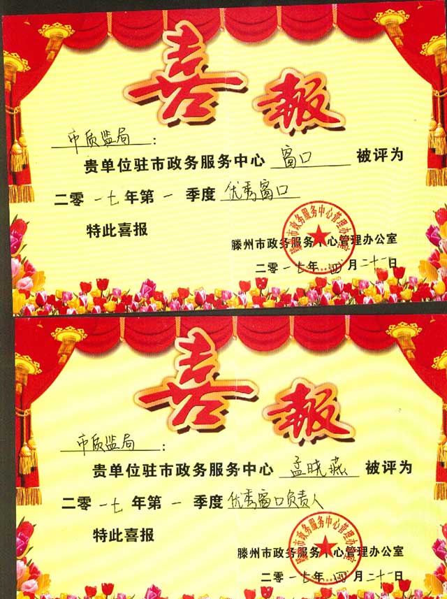 近日,滕州市政务服务中心滕州质监局窗口被市政务服务中心评为第一季度“优秀窗口”。第一季度,滕州质监局窗口从创新工作模式、规范各项规章制度、提升工作人员素质入手,坚持“便民、为民、高效”的服务宗旨,积极推进行政审批制度改革,改进审批方式,范办件流程,提高行政审批效率,提升服务水平,受到广大群众和社会各界的一致好评。孟晓燕荣获“优秀窗口负责人”称号,徐同坡、邱玲容获“服务明星”称号。