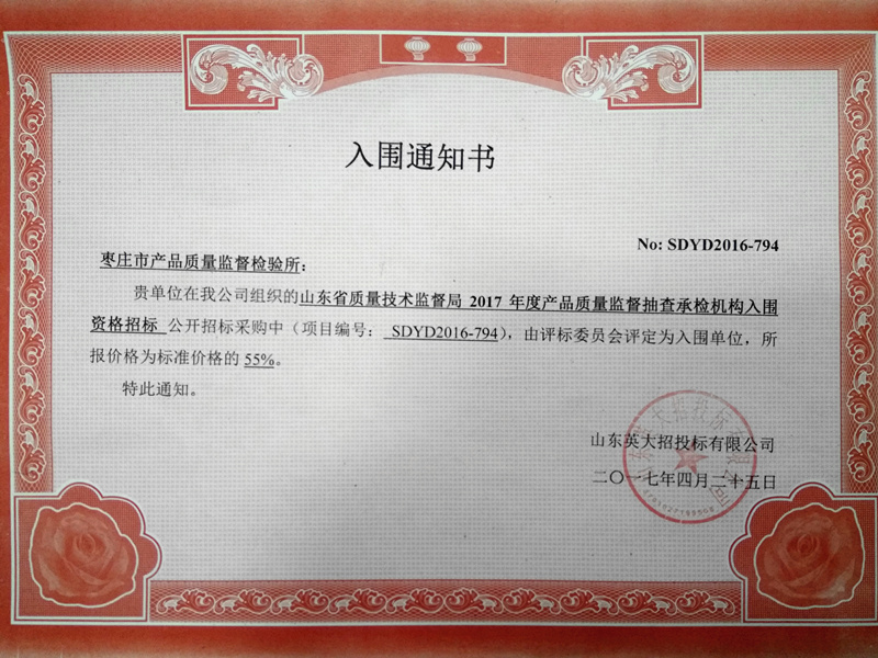 经过前期的精心准备,近日,潍坊市产品质量监督检验所成功入围山东省质量技术监督局2017年度产品质量监督抽查承检机构,并领取了《入围通知书》。此次招标是山东省质量技术监督局首次在全国范围内公开、透明、不设地域限制的择优选择承担山东省内产品质量监督抽查的技术机构。