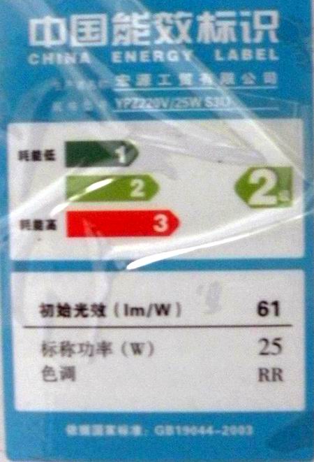 节能灯的能耗标识为蓝白背景的彩色标识,内容包括: (1)生产者名称;(2)产品规格型号;(3)能源效率等级;(4)额定功率(W);(5)色调;(6)初始光效(lm/W);(7)依据的能源效率国家标准编号